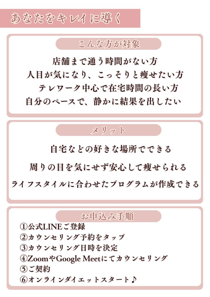 A. お客様一人ひとりの目標達成に向けて、スタッフがしっかりとサポートいたします。定期的なカウンセリングや専用アプリにて進捗確認を行い、モチベーションを維持できるようサポートいたします。当店のプログラムで、多くのお客様が効果を実感されています。